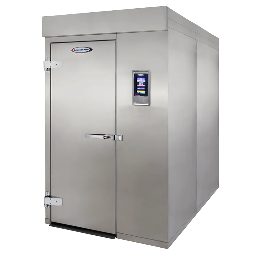 Innovative Cold Storage Mastery. Introducing the American Panel Corporation AP20BC-2T Blast Chiller, Roll-In. Designed for commercial restaurant use, this modular blast chiller is a game-changer in the food industry. With its remote refrigeration system, it can accommodate up to two trolleys measuring 26" W x 32" D x 73.5" H, allowing for efficient and convenient chilling of large quantities of food. Boasting a remarkable chill capacity of 400 lbs. in just 90 minutes or 460 lbs. in 120 minutes, this chiller ensures rapid and safe cooling from 160°F to 38°F. The 7" LCD touch screen controller with Quick Start & A La Carte functionality simplifies operation, while the insulated panels and camlock assembly guarantee optimal insulation and easy assembly. With programmable features and a core temperature probe included, this stainless steel interior and exterior blast chiller is a must-have for any commercial restaurant seeking to enhance food safety and efficiency. Trust American Panel Corporation for superior cold storage solutions.