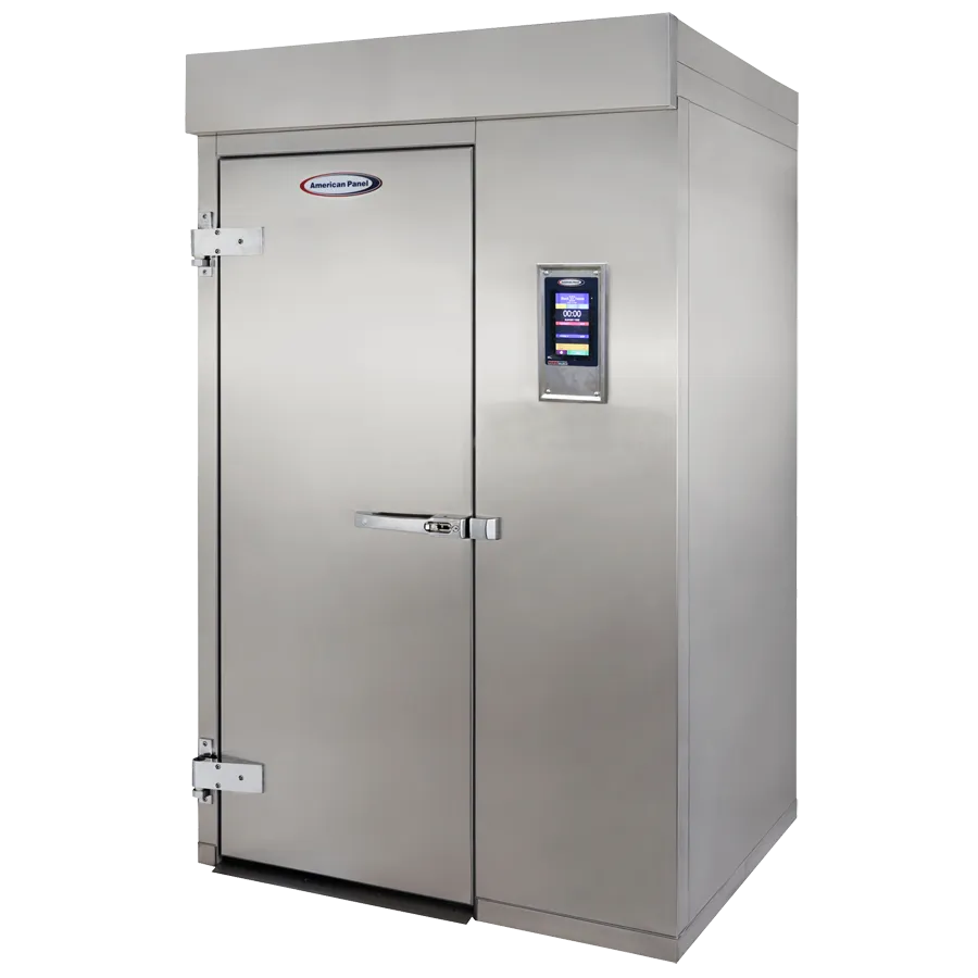 Introducing the American Panel Corporation AP46BC-1T Blast Chiller, Roll-In - the essential solution for food preservation excellence in commercial restaurants. This HURRiCHiLL Modular Blast Chiller is designed to meet the demanding needs of busy kitchens, ensuring food safety and quality. With its remote refrigeration system, it can accommodate a 35" W x 39" D x 73.5" H trolley, making it perfect for large-scale operations. The chiller has an impressive chill capacity, capable of rapidly cooling 460 lbs. from 160F to 38F in just 90 minutes or 530 lbs. in 120 minutes. The 7" LCD touch screen controller with Quick Start & A La Carte functionality allows for easy and precise operation. The insulated panels and camlock assembly ensure optimal temperature retention. Whether you prefer automatic or manual operation, this programmable blast chiller is a reliable addition to any commercial kitchen. It also comes with a core temp probe and features a durable stainless steel interior and exterior. Trust American Panel Corporation for top-quality, industry-leading refrigeration solutions.