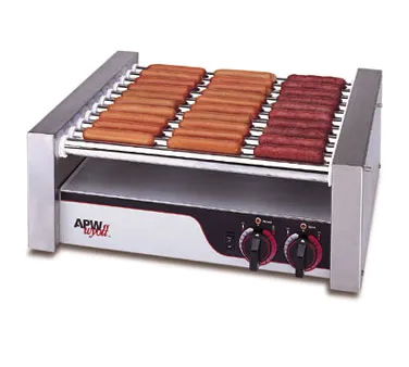 Unlock culinary potential with the APW Wyott HR-20 Hot Dog Grill. This commercial-grade hot dog grill is a must-have for any restaurant looking to serve up delicious hot dogs with ease. With its X*PERT HotRod design and 10 chrome surface rollers, this grill ensures even cooking and perfectly grilled hot dogs every time. The infinite controls allow for precise temperature adjustments, while the removable grease pan makes cleaning a breeze. The stainless steel exterior and coated steel bottom not only provide durability but also give the grill a sleek and professional look. Certified by UL, CSA, NSF, and CE, this hot dog grill meets the highest safety and quality standards. Whether you're running a food truck, concession stand, or restaurant, the APW Wyott HR-20 Hot Dog Grill is the ideal choice for serving up mouthwatering hot dogs that will keep your customers coming back for more.