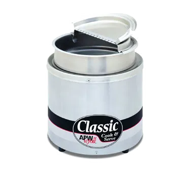 Introducing the APW Wyott RCW-11SP Food Pan Warmer/Cooker, a must-have for any commercial restaurant kitchen. This electric countertop unit is designed to make your cooking and serving experience a breeze. With its 11 quart capacity, you can easily prepare and keep your food warm for extended periods. Whether you're serving soups, stews, or sauces, this versatile cooker/warmer can handle both wet and dry operations. The thermostatic controls allow you to adjust the temperature precisely, ensuring your dishes are always served at the perfect temperature. The stainless steel well and housing not only provide durability but also make cleaning a breeze. This unit comes complete with an 11 quart inset, ladle, and cover, giving you everything you need to get started. Invest in the APW Wyott RCW-11SP Food Pan Warmer/Cooker and experience the joy of cooking with premium equipment.