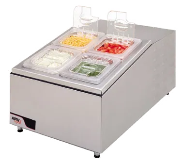 Introducing the APW Wyott RTR-4 Refrigerated Countertop Pan Rail, a must-have for any commercial restaurant seeking to elevate their gastronomic creations. This self-contained refrigeration unit is designed to keep your toppings fresh and easily accessible, ensuring that every dish is a masterpiece. With its stainless steel construction and hinged removable covers, this pan rail is not only durable but also easy to clean, making it perfect for busy kitchen environments. The 1/6 size pans provide ample space for a variety of toppings, allowing you to cater to diverse customer preferences. Equipped with 1/2" non-adjustable legs and a 1/6 HP compressor, this unit is both stable and efficient. Trust APW Wyott, a renowned vendor in the industry, to deliver a refrigerated countertop pan rail that combines functionality, reliability, and style. Elevate your culinary creations with the APW Wyott RTR-4 Refrigerated Countertop Pan Rail.
