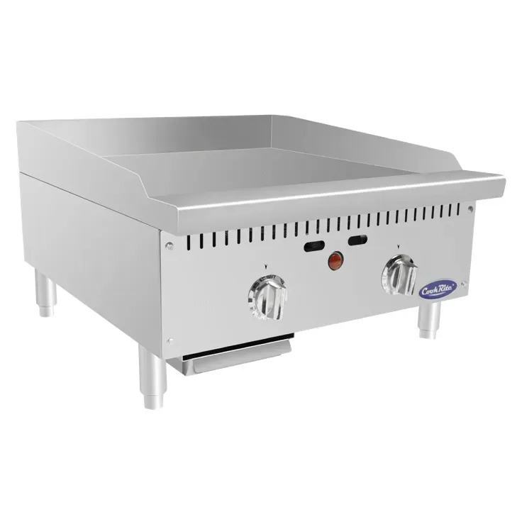 Introducing the Atosa USA, ATTG-24, Griddle, Gas, Countertop - the perfect addition to drive restaurant profitability. This CookRite Heavy Duty Griddle is designed to meet the demands of a busy commercial kitchen. With a spacious 24"W x 28-3/5"D x 15-1/5"H size and a 23-9/10"W x 19-9/10"D cooking area, it provides ample space to cook multiple dishes simultaneously. The 1" thick griddle plate ensures even heat distribution for consistent cooking results. Equipped with two stainless steel burners and standby pilots, this griddle offers precise temperature control and quick heat-up times. The thermostatic controls allow you to easily adjust the temperature to suit different cooking needs. Made with a durable stainless steel structure and adjustable stainless steel legs, this griddle is built to withstand the rigors of a commercial kitchen. With a total of 50,000 BTU's, this griddle delivers powerful performance. Trust Atosa USA for high-quality, reliable equipment that enhances your restaurant's efficiency and profitability.