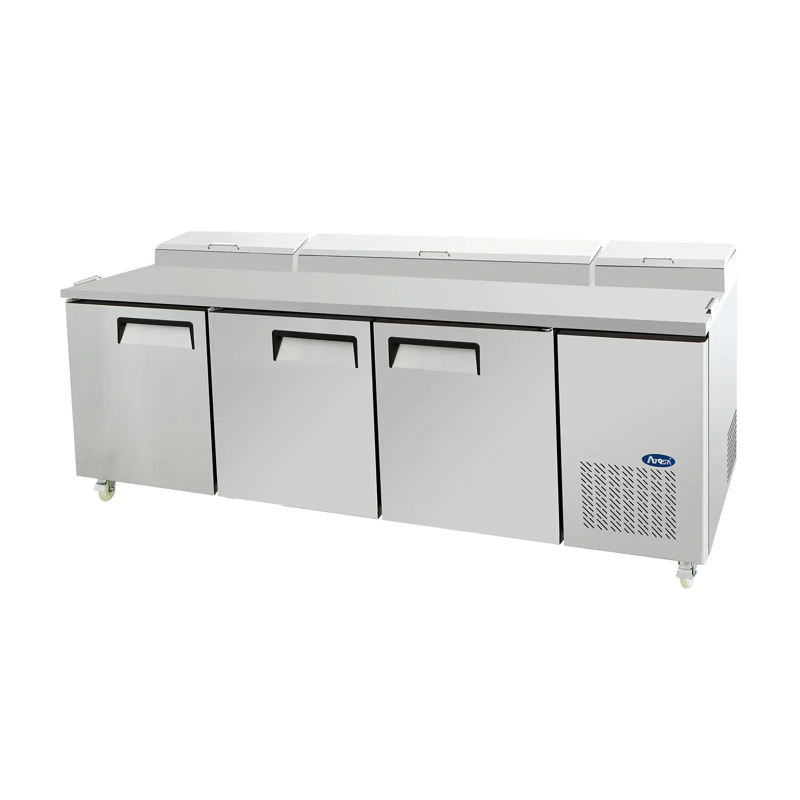 Optimize your kitchen efficiency with the Atosa USA, MPF8203GR Refrigerated Counter, Pizza Prep Table. This three-section prep table is designed to streamline your restaurant operations and enhance productivity. With a spacious 28.4 cu. ft. capacity, it offers ample storage for all your pizza ingredients. The three self-closing hinged solid doors with locks ensure the freshness and security of your ingredients. The digital temperature control allows you to maintain a temperature range of 33° to 38°F, keeping your ingredients at the perfect temperature for optimal taste and quality. The included 19" poly cutting board provides a convenient workspace for preparing pizzas, while the 12 stainless steel pans offer easy organization and access to your toppings. Made with a stainless steel interior and exterior, as well as a galvanized steel back, this prep table is built to withstand the demands of a commercial kitchen. The 5" casters make it easy to move and clean the unit. With its reliable performance and durable construction, the Atosa USA, MPF8203GR Refrigerated Counter, Pizza Prep Table is a must-have for any commercial restaurant.