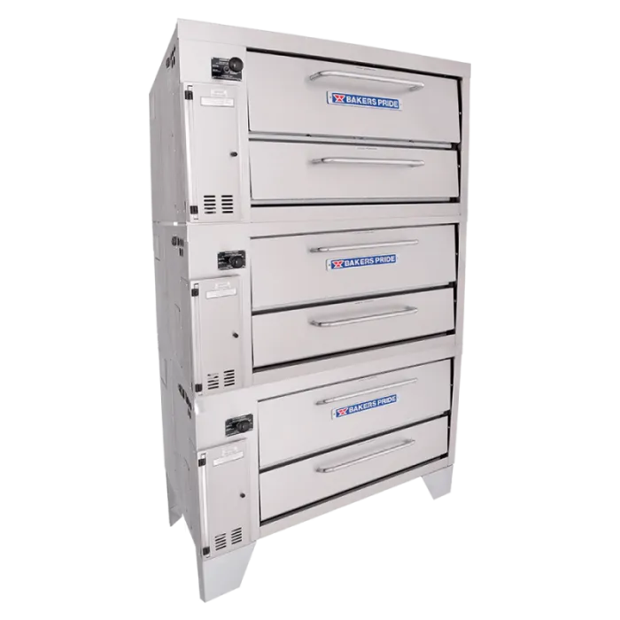 The Bakers PrideĀ® model 253 standard-depth triple-stacked gas pizza oven is designed for all your high-volume baking needs. This triple-stacked oven features three Cordierite decks with 8" deck heights and independently controlled top and bottom heat dampers for perfectly balanced results.This 48" wide model is constructed with heavy-duty angle iron frame, which is fully welded to allow for stacking. The oven exterior is heavy-duty stainless steel and fully insulated for cooler outer temperatures and consistent interior temperatures.
