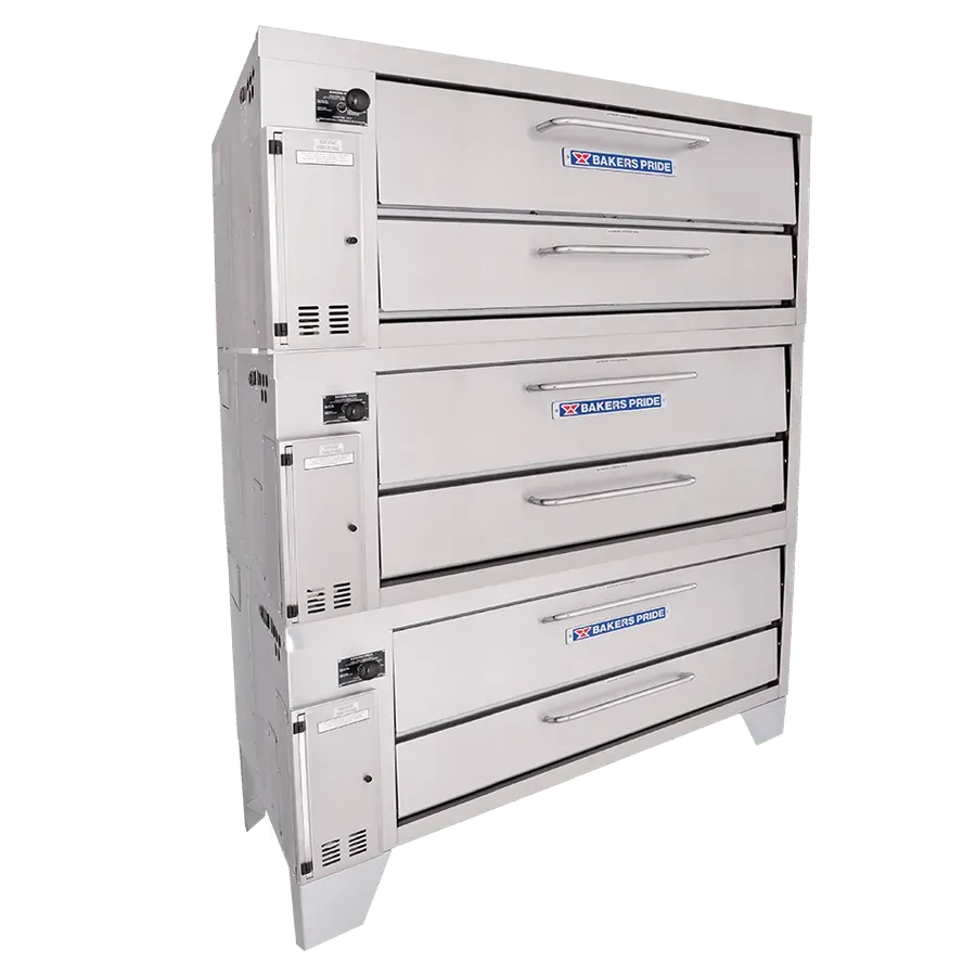 Ideal for kitchens with narrow aisles, the Bakers PrideĀ® model 4153 triple-stacked gas pizza oven is designed with a shallow depth to save space while accommodating the high-volume needs of traditional cook lines. This triple-stacked oven features three Cordierite decks with 8" deck heights and independently controlled top and bottom heat dampers for perfectly balanced results. This 66" wide model is constructed with heavy-duty angle iron frame, whites fully welded to allow for stacking. The oven exterior is heavy-duty stainless steel and fully insulated for cooler outer temperatures and consistent interior temperatures.