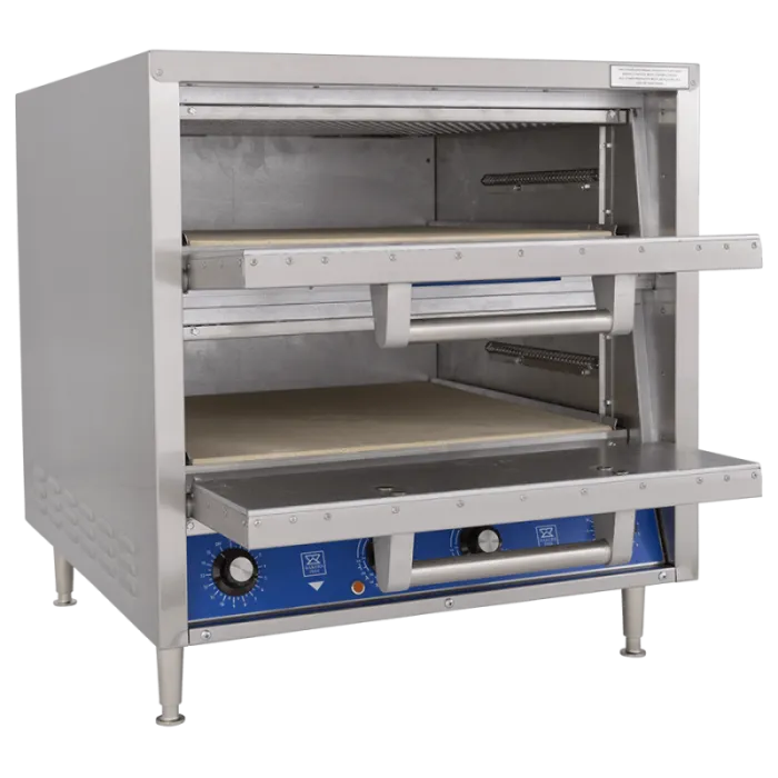 The Bakers Pride® model DP-2 oven features two independently controlled baking chambers, each with one Cordierite deck and a 5.5" deck height. The greater deck height allows you to accommodate all kinds of bakery items from pizzas to muffins to souffles. The incoloy heating elements and aluminized steel baking chambers are perfect for high heat, while the electronic timers allow for easy and precise operation. This model also features a stainless steel exterior and comes with 4” adjustable legs. International voltages are available.