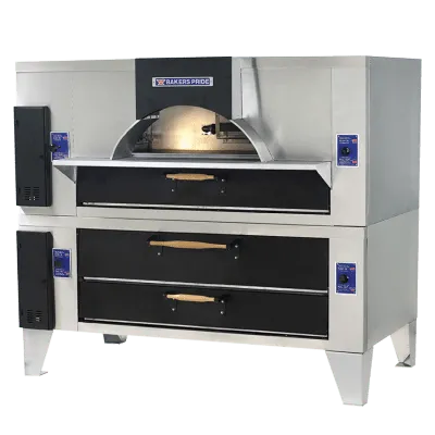 The Bakers PrideĀ® model FC-816/Y-800 pizza oven combines our Il Forno Classico oven with the Y-800 oven to add ambiance while doubling cooking capacity for the ultimate exhibition pizza kitchen. The top features a steel-reinforced, arched opening with a visible, open-flame burner to make loading pizzas easy while create dining atmosphere. This model is constructed with heavy-duty, .25" angle iron frame, which is fully welded to allow for stacking. It is designed to be built in behind a decorative facade of brick, stone, or tile for a traditional, old-world look, or you can simply display it in stainless steel or finish it with black-powder-coated control panels and hardwood door handles for an elegant presentation. The top oven has a Cordierite deck with 10" deck height, while the bottom oven has a Lightstone fibrament deck with 8" deck height. Each oven chamber features independently controlled top and bottom heat dampers for perfectly balanced results.