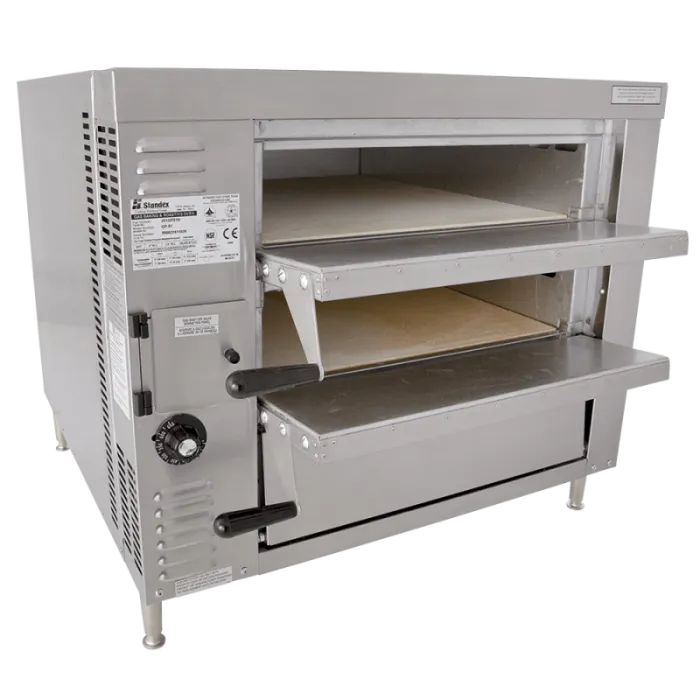 The Bakers Pride® model GP61-HP oven features high-performance burners that are perfect for baking pizza, pretzels, flatbreads, or other bakery items. This model features two baking chambers, each with one Cordierite deck. The lower decks are perfect for rapid baking, while the upper decks offers precision for slower baking. Deck height is 6" on the lower decks and 5" on the upper decks, but for more flexibility, the upper decks can be easily removed to create a 12” deck height. Doors are bottom-hinged with field-reversible handles for left- or right-hand operation. You also have the option of ordering single doors in lieu of double doors. This model comes standard with a stainless steel exterior and 4” adjustable legs and is available for use with natural gas or liquid propane. A standard combination valve incorporates a manual gas valve, pilot safety, and gas regulator.