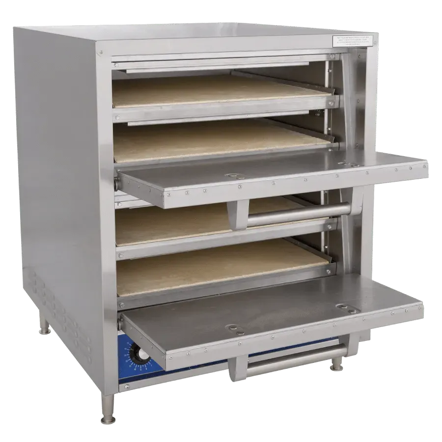 The Bakers Pride® model P44-BL oven is a great choice for fresh-dough pizza, prebaked crust, pretzels, flatbreads, and other bakery products. Bake directly on the deck or on screens, pans, or baking sheets. This oven has two independently controlled cooking chambers, each featuring two brick-lined decks and 2.75" deck heights. Brick-lined ovens have an additional Cordierite stone above the deck, which helps the oven retain heat longer and recover temperatures quickly. Each chamber also has a 15-minute, electric timer with continuous-ring alarm and manual shut-off. This oven comes standard with a stainless steel exterior and 4” adjustable legs. International voltages are available. Ovens are stackable.