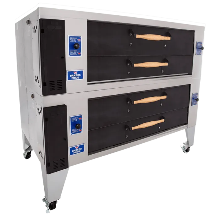 The Bakers PrideĀ® model Y-602-DSP extra-wide gas pizza oven is perfect for display cooking and exhibition kitchens. This double-stacked model is designed to be built in behind a decorative facade of brick, stone, or tile. Optional front and side skirts allow tile or stone to be easily installed around the legs, while an optional dome top accent finishes off the old-world look. You also have the choice to simply display the oven in stainless steel or finish with black-powder-coated control panels and doors with hardwood handles for an elegant presentation. This model is constructed with heavy-duty, .25" angle iron frame, which is fully welded to allow for double-stacking. The oven chamber features a Lightstone fibrament deck with 8" deck height and independently controlled top and bottom heat dampers for perfectly balanced results. Options are available to suit the configuration of your kitchen, such as side-mounted controls or automatic oven starter.