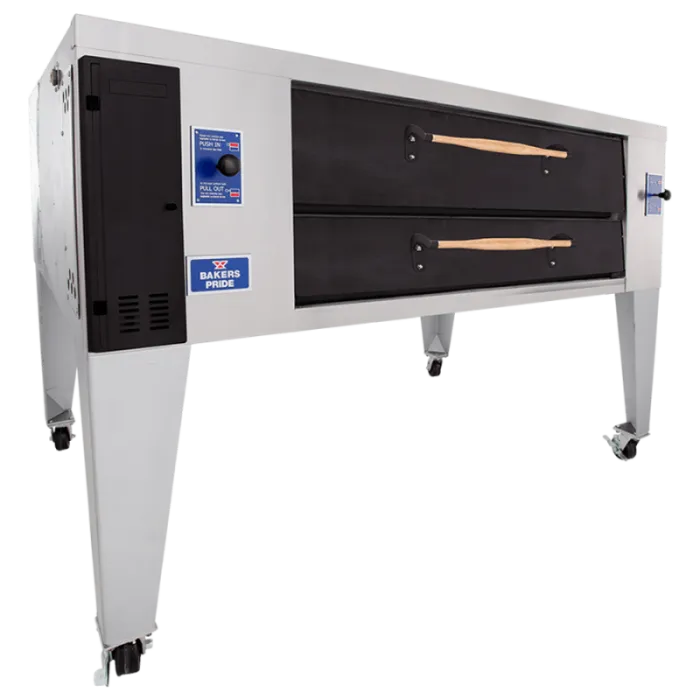 The Bakers PrideĀ® model Y-800-DSP extra-wide gas pizza oven is perfect for display cooking and exhibition kitchens. This model is designed to be built in behind a decorative facade of brick, stone, or tile. Optional front and side skirts allow tile or stone to be easily installed around the legs, while an optional dome top accent finishes off the old-world look. You also have the choice to simply display the oven in stainless steel or finish with black-powder-coated control panels and doors with hardwood handles for an elegant presentation.This model is constructed with heavy-duty, .25" angle iron frame, which is fully welded to allow for double-stacking. The oven chamber features a Lightstone fibrament deck with 8" deck height and independently controlled top and bottom heat dampers for perfectly balanced results.Options are available to suit the configuration of your kitchen, such as side-mounted controls or automatic oven starter.