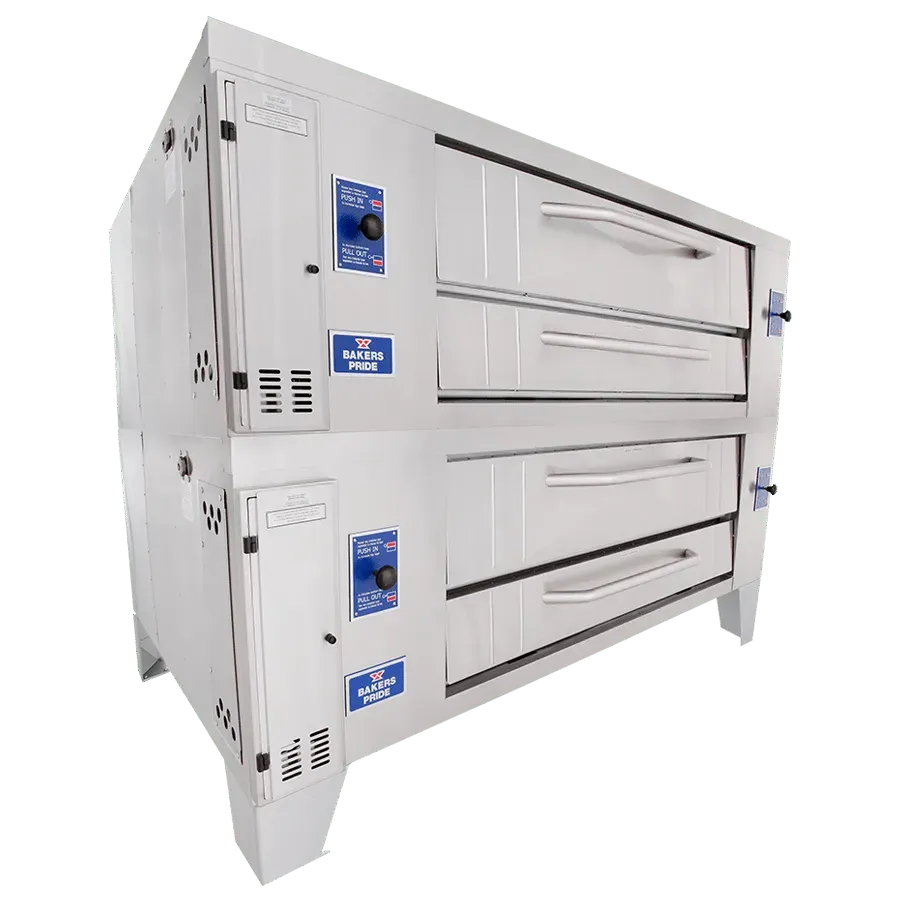 The Bakers PrideĀ® model Y-802 extra-wide gas pizza oven is perfect for high-volume pizza and all-purpose baking operations. This double-stacked model is constructed with heavy-duty, .25" angle iron frame, which is fully welded to allow for stacking. Each oven chamber features a Lightstone fibrament deck with 8" deck height and independently controlled top and bottom heat dampers for perfectly balanced results. The oven exterior is all heavy-duty, stainless steel and fully insulated for cooler outer temperatures and consistent interior temperatures.