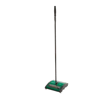 Enhance restaurant hygiene with the Bissell Big Green Commercial, BG21, Floor Sweeper. This powerful and efficient sweeper is designed to tackle the toughest cleaning tasks in a commercial restaurant setting. With a 9-1/2" cleaning path and dual rubber brushes, it effectively removes dirt, debris, and food particles from low pile carpets and bare floors. The corner brushes and floating head ensure thorough cleaning in hard-to-reach areas. The threaded handle with a comfort grip allows for easy maneuverability, while the dual debris canisters provide ample storage capacity. Equipped with rubber wheels, this sweeper glides smoothly across different surfaces without leaving any marks. Keep your restaurant clean and presentable with this high-quality floor sweeper.