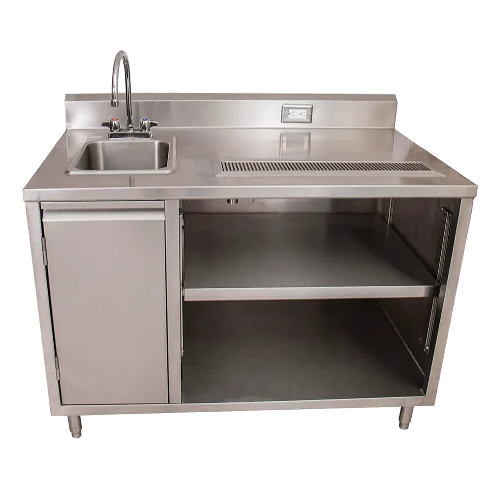 Realize kitchen dreams with the BK Resources BEVT-3060L Beverage Counter. This commercial-grade beverage table is designed to meet the demands of a busy restaurant environment. The 60"W x 30"D stainless steel top provides ample space for preparing drinks, while the 14" x 10" sink on the left side, complete with a gooseneck faucet, allows for easy cleanup. The built-in 24" urn trough with drain is perfect for holding and draining hot beverage urns. With a hinged door under the sink and an adjustable shelf, you'll have plenty of storage space for supplies and equipment. The 5" riser backsplash features a standard electric outlet, making it convenient to plug in blenders or other appliances. Supported by stainless steel legs, this beverage counter is NSF certified for food safety. Upgrade your restaurant's beverage station with the BK Resources BEVT-3060L Beverage Counter.