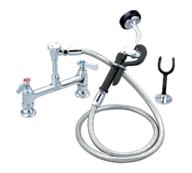 Equip your commercial kitchen with the BK Resources, BKF-8DMUS-G Pre-Rinse Faucet Assembly. This deck mount faucet is designed to meet the demands of a busy restaurant environment. With its OptiFlow Utility Spray Faucet, you can easily rinse off dishes, pots, and pans, ensuring they are thoroughly cleaned and ready for the next use. The 8" OC design provides convenience and flexibility, allowing you to position the faucet exactly where you need it. The 72" stainless steel braided hose offers durability and longevity, even with frequent use. The vacuum breaker and integral check valves prevent backflow, ensuring the safety and cleanliness of your water supply. The 1/4 turn ceramic cartridges provide smooth and precise control over water flow and temperature. This pre-rinse faucet assembly also includes a wall hook for easy storage. Plus, it is lead-free and NSF certified, guaranteeing its quality and compliance with industry standards. Upgrade your kitchen with the BK Resources, BKF-8DMUS-G Pre-Rinse Faucet Assembly and experience the convenience and reliability it brings to your restaurant operations.