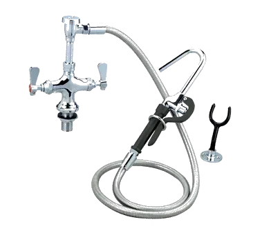 Master your restaurant's kitchen with the BK Resources BKF-DDMPF-G Faucet, Kettle / Pot Filler. This high-quality pot filler is designed to meet the demands of a busy commercial restaurant. With its OptiFlow technology, it ensures a steady and efficient flow of water, allowing you to fill pots and kettles quickly and easily. The deck mount design and single hole center make installation a breeze, while the 72" stainless steel braided hose provides flexibility and durability. The pot filler also includes a wall hook and hot/cold mixing hoses for added convenience. Its high polished nickel chrome finish not only adds a touch of elegance to your kitchen but also ensures long-lasting durability. Plus, the pot filler is lead-free, making it safe for use in any foodservice establishment. Trust BK Resources, a reputable vendor in the industry, and elevate your kitchen's functionality with the BKF-DDMPF-G Faucet, Kettle / Pot Filler.