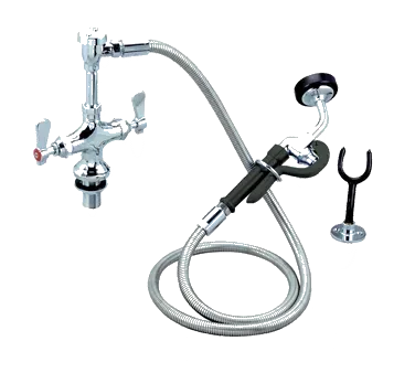 Introducing the BK Resources, BKF-DDMUS-G Pre-Rinse Faucet Assembly, designed to help you achieve culinary excellence in your commercial restaurant. This high-quality deck mount faucet is a must-have for any professional kitchen. With its OptiFlow Utility Spray Faucet and single hole center, this faucet provides maximum efficiency and convenience. The 72" stainless steel braided hose allows for easy maneuverability, while the vacuum breaker and integral check valves ensure safety and prevent backflow. The 1/4 turn ceramic cartridges guarantee smooth operation and durability. The faucet also includes a wall hook and hot/cold mixing hoses for added convenience. With its high polished nickel chrome finish, this faucet not only looks sleek but is also lead-free and NSF certified. Trust BK Resources, a reputable vendor in the industry, and invest in this Pre-Rinse Faucet Assembly to elevate your restaurant's functionality and efficiency.