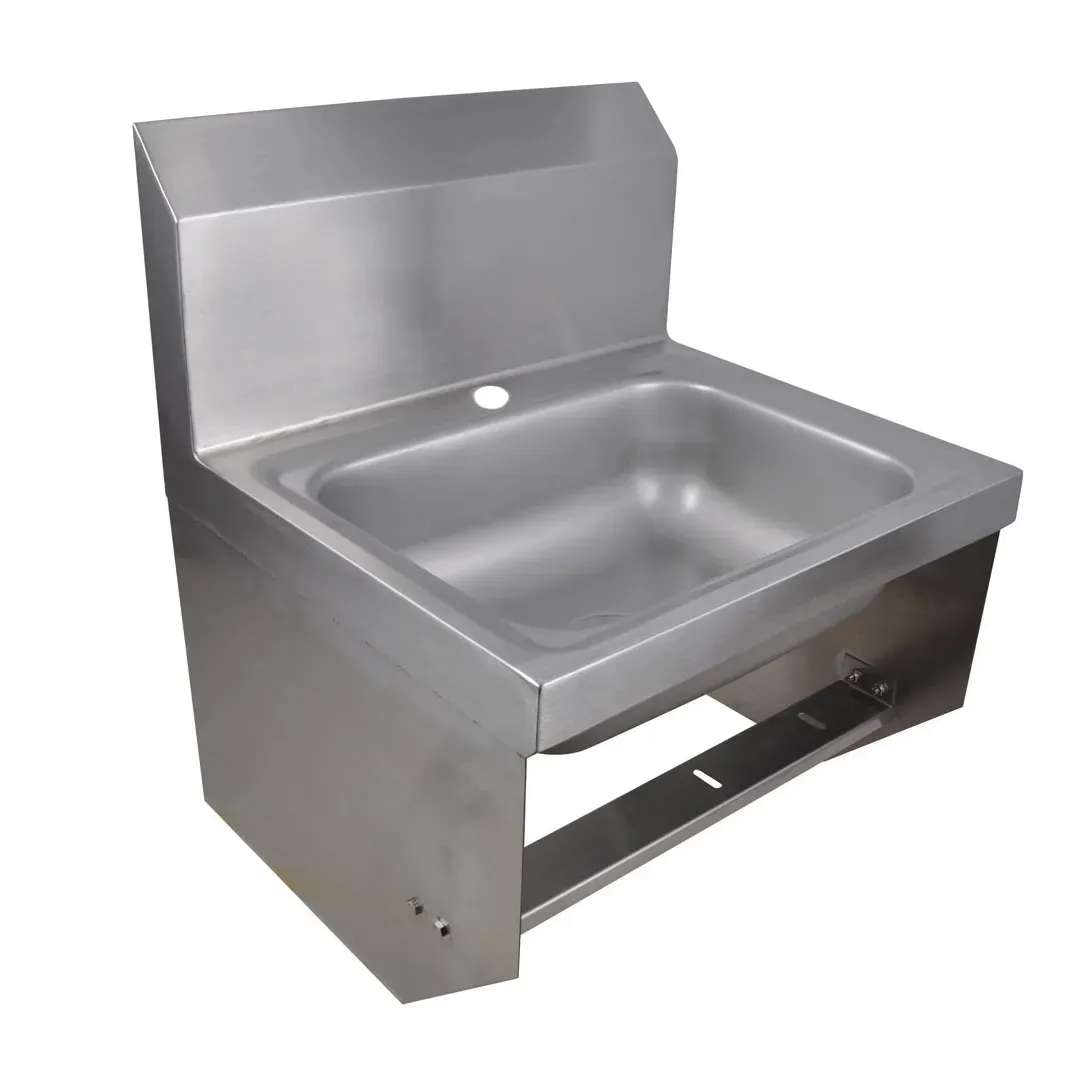 Achieve kitchen supremacy with the BK Resources, BKHS-D-1410-1-BKK Hand Sink. This wall-mounted sink is designed to meet the rigorous demands of a commercial restaurant kitchen. Made from durable 304 stainless steel, it ensures long-lasting performance and easy maintenance. The 14" wide x 10" front-to-back x 5" deep bowl provides ample space for handwashing, while the single deck mount faucet hole allows for easy installation of a faucet. The 7-3/8"H backsplash helps to keep the surrounding area clean and protected. This hand sink includes a basket drain, knee, and wall brackets for added convenience. With its NSF certification, you can trust that this sink meets the highest standards of cleanliness and sanitation. Upgrade your restaurant kitchen with the BK Resources Hand Sink and experience the perfect blend of functionality and durability.