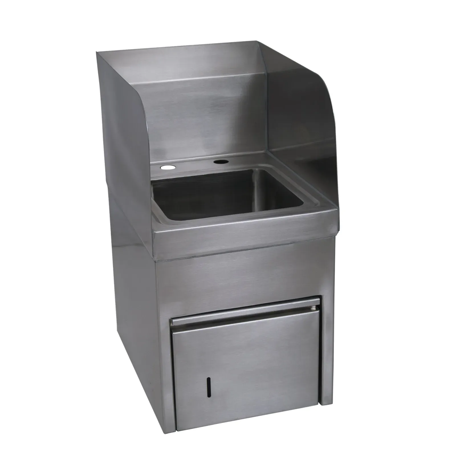 Cook with precision using the BK Resources BKHS-D-SS-SKTS Hand Sink. This wall-mounted hand sink is designed for commercial restaurant use, ensuring cleanliness and efficiency in your kitchen. The sink features a 9" wide x 9" front-to-back x 5" deep bowl, providing ample space for handwashing. With 4" OC deck mount faucet holes, you can easily install a faucet of your choice. The integrated towel dispenser on the front allows for convenient access to hand towels, promoting hygiene among your staff. The side splashes on the left and right prevent water from splashing onto surrounding surfaces, keeping your workspace clean. The 8"H backsplash provides additional protection against splashes and spills. Made of durable 304 stainless steel, this hand sink is built to withstand the demands of a busy restaurant kitchen. It also includes a basket drain (BKDR-2) and wall mounting hardware for easy installation. Trust BK Resources for reliable and high-quality restaurant equipment.