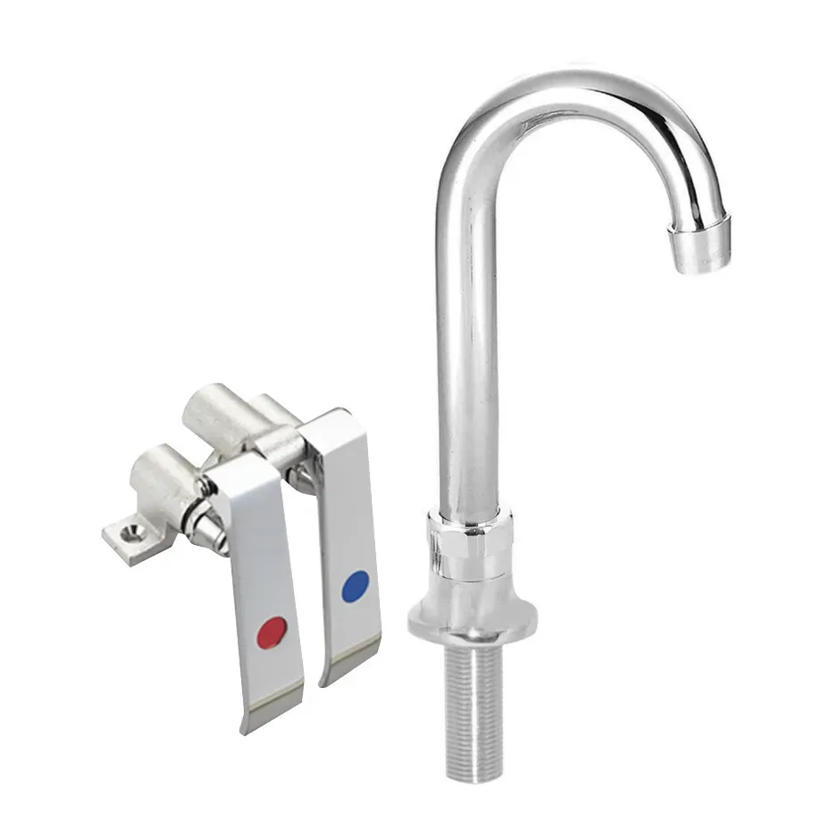 Introducing the BK Resources, BKKV-DGS-G Knee Valve, designed to simplify restaurant operations. This knee valve kit is a must-have for any commercial restaurant, offering convenience and efficiency. The kit includes a dual pedal system, allowing for easy hands-free operation. With its deck mounted 3-1/2" gooseneck spout, this knee valve provides a steady flow of water, perfect for washing dishes or filling pots. The cast body and chrome plated pedals ensure durability and longevity, making it a reliable choice for busy kitchens. Plus, it is lead-free and NSF certified, guaranteeing the highest standards of safety and quality. Please note that the knee valve bracket for hand sinks is not included. Trust BK Resources, a reputable vendor in the industry, and enhance your restaurant's workflow with the BKKV-DGS-G Knee Valve.