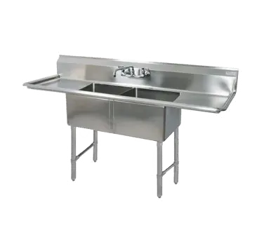 Achieve culinary excellence with the BK Resources, BKS-2-18-12-18T Sink, (2) Two Compartment. This top-of-the-line sink is designed to meet the demands of a busy commercial restaurant kitchen. With its 18/304 stainless steel construction, it offers durability and resistance to corrosion, ensuring long-lasting performance. The sink features two spacious 18" wide x 18" front-to-back x 12" deep compartments, providing ample space for washing and rinsing dishes. It also includes two 18" drainboards on the left and right sides, allowing for efficient drying and organization. The 9" backsplash and 8" OC splash mount faucet holes enhance cleanliness and convenience. The rolled edges on the front and sides add strength and safety. This sink comes with basket drains for easy waste disposal. Supported by galvanized steel legs with adjustable high impact corrosion-resistant feet, it offers stability and flexibility. NSF certified, this BK Resources sink is the perfect addition to any commercial restaurant kitchen, ensuring optimal functionality and hygiene.