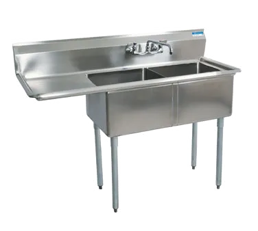 Equip your kitchen for success with the BK Resources, BKS-2-24-14-24L Sink. This two-compartment sink is designed to meet the demands of a busy commercial restaurant. With its 18/304 stainless steel construction, it offers durability and resistance to corrosion, ensuring long-lasting performance. The sink features two 24" wide x 24" front-to-back x 14" deep compartments, providing ample space for washing and rinsing dishes. The 24" drainboard on the left side offers convenient drying and storage space. The sink also includes a 9" backsplash and 8" OC splash mount faucet holes, making it easy to install and use. The rolled edges on the front and sides add strength and prevent spills. Additionally, the sink comes with basket drains for efficient waste management. Supported by galvanized steel legs with adjustable high impact corrosion-resistant feet, this NSF-certified sink is a reliable and practical choice for any commercial kitchen.