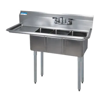 Transform your food service with the BK Resources, BKS-3-1014-10-15L Sink. This three-compartment convenience store sink is designed to meet the demands of a busy commercial restaurant. With its 47-1/2" width and 19-13/16" depth, it provides ample space for washing and rinsing dishes. The 10" wide x 14" front-to-back x 10" deep compartments are perfect for accommodating large pots and pans. The 15" drainboard on the left side allows for easy drying and stacking of clean dishes. The 9" high backsplash helps to prevent water splashes and spills, keeping your kitchen clean and safe. The 1-1/2" rolled edges on the front and sides add durability and strength to the sink. Made of 18/304 stainless steel, this sink is resistant to corrosion and easy to clean. The galvanized steel legs with adjustable high impact corrosion-resistant feet provide stability and support. With its NSF certification, you can trust the quality and reliability of this BK Resources sink. Upgrade your restaurant's kitchen with the BKS-3-1014-10-15L Sink and experience enhanced efficiency and functionality.