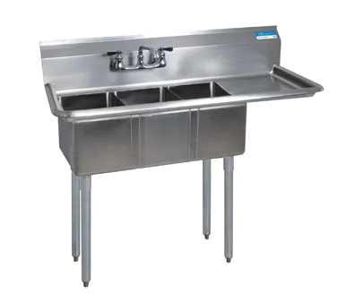 Unleash your kitchen's potential with the BK Resources, BKS-3-1014-10-15R Sink. This three-compartment convenience store sink is designed to meet the demands of a busy commercial restaurant. With its 47-1/2" width, 19-13/16" depth, and 39-3/4" height, this sink provides ample space for all your washing needs. The three 10" wide x 14" front-to-back x 10" deep compartments allow for efficient washing, while the 15" drainboard on the right provides a convenient space for drying dishes. The 9" backsplash and 8" OC splash mount faucet holes ensure a clean and sanitary workspace. Made from 18/304 stainless steel, this sink is durable and resistant to corrosion. The rolled edges on the front and sides add strength and prevent spills. The galvanized steel legs with adjustable high impact corrosion-resistant feet provide stability and support. NSF approved, this sink is a reliable and essential addition to any commercial kitchen.