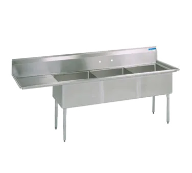 Equip your commercial kitchen with the BK Resources, BKS-3-18-12-18L Sink, (3) Three Compartment. This stainless steel sink is designed to meet the demands of a busy restaurant environment. With its three compartments, each measuring 18 inches wide, 18 inches front-to-back, and 12 inches deep, you'll have plenty of space for washing, rinsing, and sanitizing dishes. The sink also features an 18-inch drainboard on the left side, allowing you to easily dry dishes and utensils. The 9-inch backsplash helps to keep your walls clean and protected, while the 8-inch OC splash mount faucet holes provide easy access to water. The rolled edges on the front and sides add durability and prevent spills. This sink comes with basket drains for added convenience. With its high-quality construction and adjustable corrosion-resistant feet, this BK Resources sink is NSF certified and built to withstand the rigors of a commercial kitchen. Upgrade your kitchen today and experience the convenience and durability of the BKS-3-18-12-18L Sink.