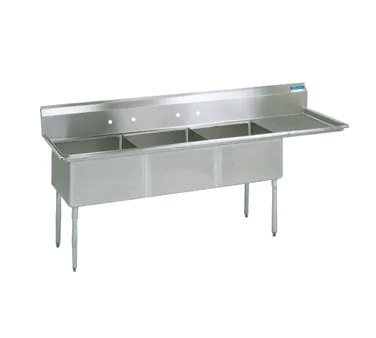 Maximize your food service potential with the BK Resources, BKS-3-24-14-24R Sink. This three-compartment sink is designed to meet the demands of a busy commercial restaurant. With an overall size of 98-1/2"W x 29-13/16"D x 43-3/4"H, it provides ample space for washing, rinsing, and sanitizing dishes. The sink features three compartments, each measuring 24" wide x 24" front-to-back x 14" deep, allowing for efficient workflow and easy cleaning. The 24" drainboard on the right provides a convenient space for drying dishes. The sink is made of durable 18/304 stainless steel construction, ensuring long-lasting performance in a demanding kitchen environment. It also includes basket drains for added convenience. The galvanized steel legs and adjustable high impact corrosion-resistant feet provide stability and durability. NSF certified, this sink meets the highest standards of cleanliness and sanitation. Upgrade your restaurant's kitchen with the BK Resources, BKS-3-24-14-24R Sink and experience enhanced efficiency and productivity.