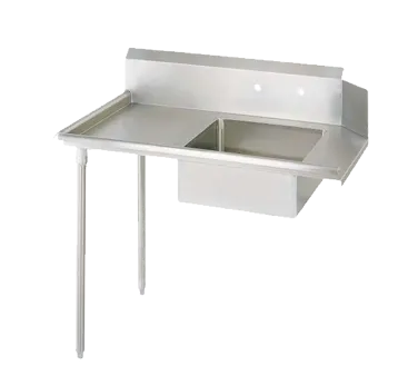 Unleash culinary creativity with the BK Resources, BKSDT-48-L Dishtable, Soiled. This straight design dishtable is perfect for commercial restaurant use, offering a spacious 48"W x 30-3/8"D x 46-1/4"H size that can handle the demands of a busy kitchen. The 18/304 stainless steel top ensures durability and easy cleaning, while the 10"H backsplash provides added protection against spills and splashes. The dishtable features a convenient left-to-right operation, allowing for efficient workflow. It also includes a 20" x 20" x 8" deep pre-rinse sink with an 8" OC splash mount faucet holes, making it easy to rinse off soiled dishes. The raised rolled edges on the front and side prevent water from spilling onto the floor. With galvanized steel legs and side bracing, as well as high impact corrosion resistant adjustable bullet feet, this dishtable is built to withstand the rigors of a commercial kitchen. NSF certified, this dishtable meets the highest standards of sanitation and hygiene. Upgrade your restaurant's dishwashing area with the BK Resources, BKSDT-48-L Dishtable, Soiled.