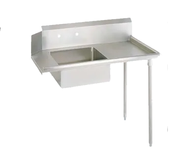 Unleash culinary creativity with the BK Resources, BKSDT-48-R Dishtable, Soiled. This straight design dishtable is perfect for commercial restaurant use, offering a spacious 48"W x 30-3/8"D x 46-1/4"H size that can handle the demands of a busy kitchen. Made with 18/304 stainless steel, it ensures durability and longevity, even in high-traffic environments. The 10"H backsplash and raised rolled edges on the front and side provide added protection against spills and splashes, keeping your workspace clean and hygienic. The dishtable also features a 20" x 20" x 8" deep pre-rinse sink with an 8" OC splash mount faucet holes, allowing for efficient pre-rinsing of dishes. With galvanized steel legs and side bracing, as well as high impact corrosion resistant adjustable bullet feet, this dishtable is built to withstand the rigors of a commercial kitchen. NSF certified, it meets the highest standards of sanitation and safety. Upgrade your restaurant's dishwashing area with the BK Resources, BKSDT-48-R Dishtable, Soiled.