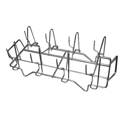 Half-size (13” x 18”) wire shelf with protruding holders. Will accommodate (8) chickens/poultry. The spikes heat the product from the inside while the combi heats it from the outside. Fits perfectly inside a standard hotel pan to capture drippings for gravies and/or easy oven clean up.