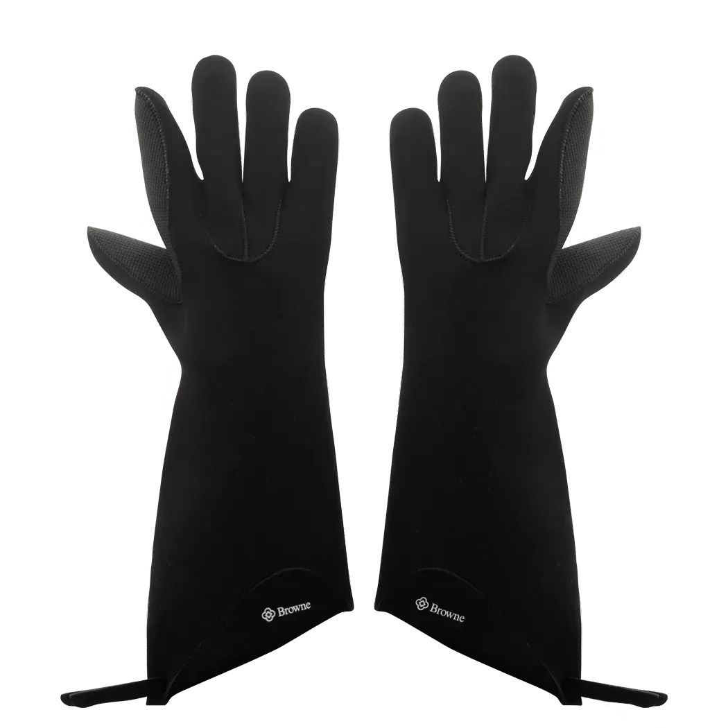 Upgrade your commercial restaurant with the Browne Foodservice, 5430702, Safety - KITCHEN GRIPS. This essential kitchen glove is designed to enhance safety and efficiency in a busy restaurant setting. With its 17-inch length and flexible FLXaPrene material, this black glove provides maximum protection and dexterity for your staff. The five-finger design allows for a secure grip on hot pots, pans, and utensils, reducing the risk of accidents and injuries. Whether your chefs are handling sizzling steaks or boiling pots, these KITCHEN GRIPS are a must-have for any commercial kitchen. Invest in the best-in-class essentials and elevate your restaurant's safety standards with Browne Foodservice, 5430702, Safety - KITCHEN GRIPS.