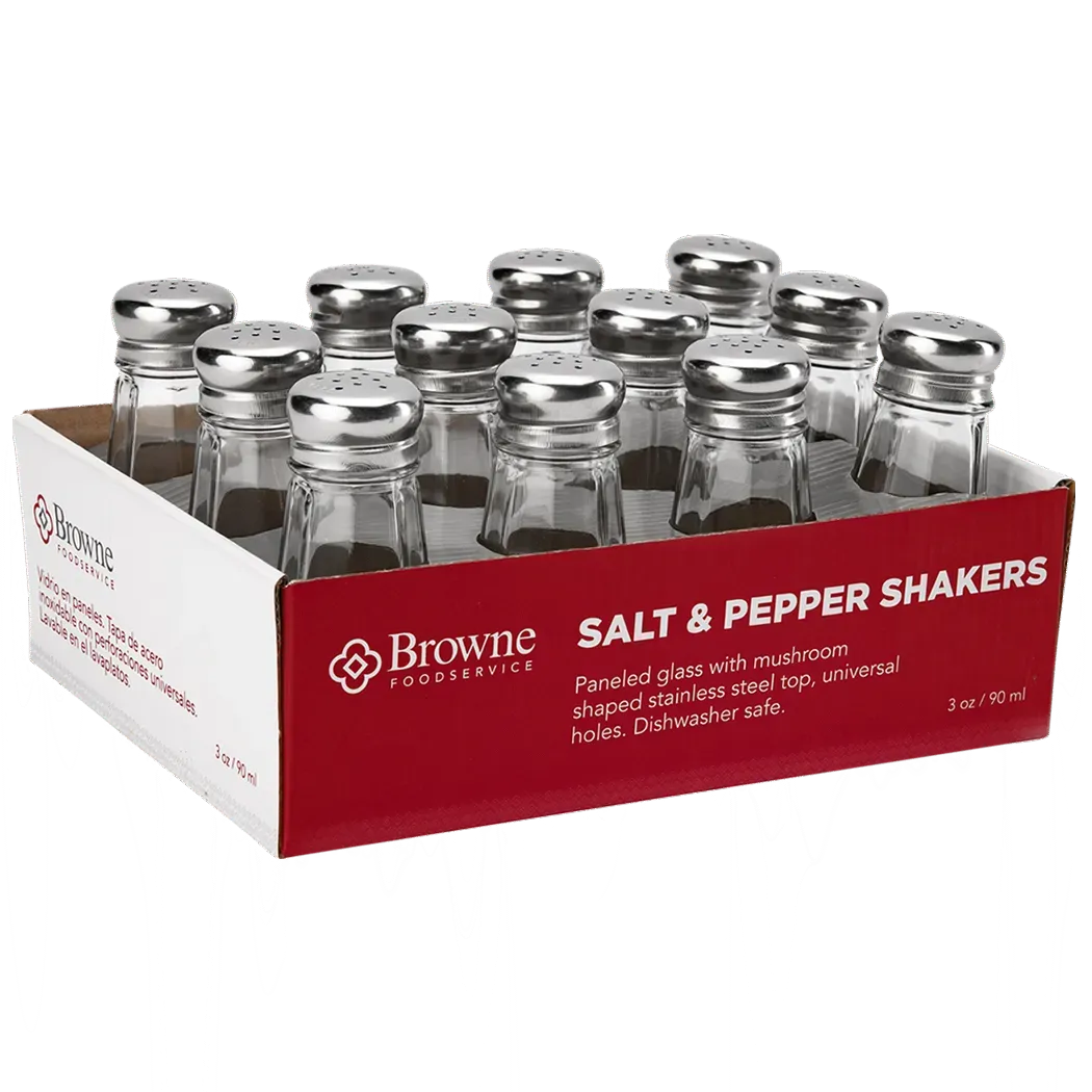 Enhance your restaurant's offerings with the Browne Foodservice, 575223 Tabletop Accessories - Shakers & Pourers. This set of 12 S&P shakers is a must-have for any commercial restaurant. Each shaker is made of durable glass with a stainless steel top, ensuring long-lasting use in a busy kitchen environment. With a capacity of 3oz/90ml, these shakers are perfect for seasoning dishes and adding a touch of flavor to your culinary creations. These shakers are not only practical but also visually appealing, adding a touch of elegance to your tabletop presentation. Whether you're a fine dining establishment or a casual eatery, the Browne Foodservice, 575223 Tabletop Accessories - Shakers & Pourers will elevate your dining experience and impress your customers.
