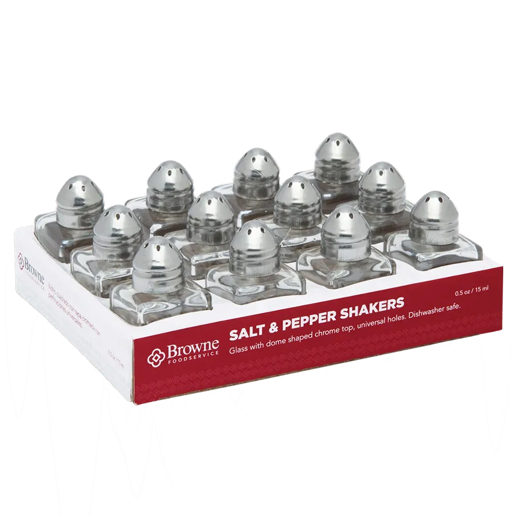Create masterpieces with state-of-the-art utensils. Introducing Browne Foodservice, 575225, Tabletop Accessories - Shakers & Pourers. This S&P Shaker Mini 0.5oz/15ml Glass with Chrome Top is a must-have for any commercial restaurant. Made with high-quality glass and a sleek chrome top, these shakers not only add a touch of elegance to your tabletop but also ensure durability and longevity. The compact size allows for easy handling and storage, making them perfect for busy kitchen environments. Whether you're seasoning dishes or adding a finishing touch to cocktails, these shakers provide precise and controlled pouring, ensuring consistent flavor distribution. With Browne Foodservice, you can trust that you're getting a reliable product that meets the demands of a commercial restaurant. Enhance your culinary creations and elevate the dining experience with Browne Foodservice, 575225, Tabletop Accessories - Shakers & Pourers.