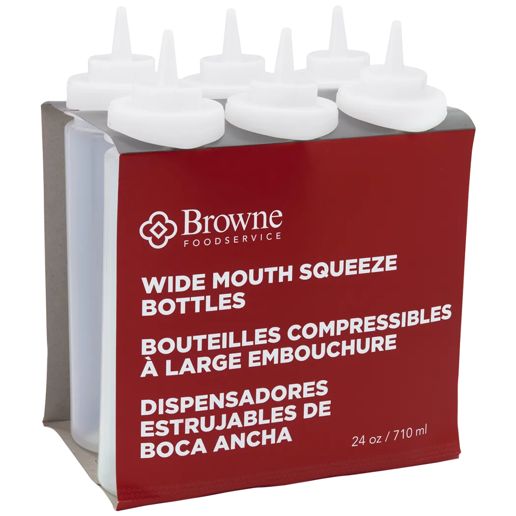 Boost functionality with quality tools like the Browne Foodservice 57802500 Tabletop Accessories - Squeeze Bottles. Designed for commercial restaurant use, these squeeze bottles are a must-have for any professional kitchen. With a generous capacity of 24oz/710ml, these wide-mouth bottles allow for easy filling and dispensing of sauces, dressings, and condiments. The clear design ensures quick identification of contents, while the set of 6 provides ample supply for busy service periods. Made by Browne Foodservice, a trusted name in the industry, these squeeze bottles are built to withstand the demands of a commercial kitchen. Whether you're running a bustling restaurant or a busy catering service, these squeeze bottles will streamline your operations and enhance efficiency. Invest in the Browne Foodservice 57802500 Tabletop Accessories - Squeeze Bottles and experience the convenience and durability that professionals rely on.