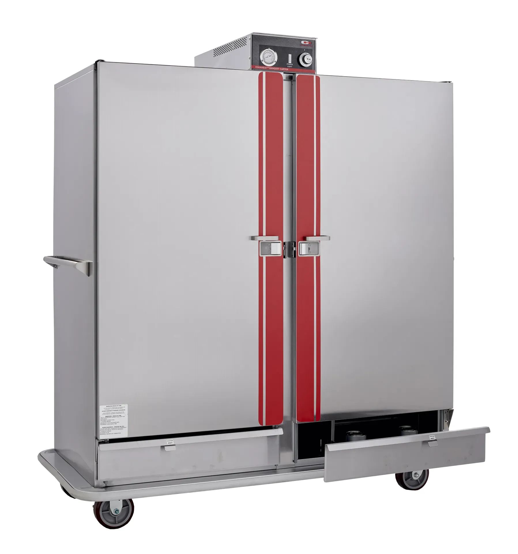 Heated Banquet Cart. Provides equal performance with electrical or canned fuel. Ideal for locations where electricity is not readily available. Equipped with canned fuel drawers and top mounted heater and a precision-engineered heat distribution system for even heating throughout. Capacity: 150 covered plates up to 11" diameter