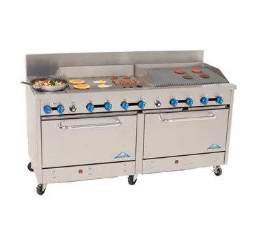 Elevate your culinary offerings with state-of-the-art gear. Introducing the Comstock-Castle 2F330-30-2.5RB Range, a must-have for any commercial restaurant. This 72" wide gas range is designed to meet the demands of a busy kitchen, ensuring efficient and precise cooking every time. Equipped with two 24,000 BTU star burners and 12" square cast iron grates, this range provides exceptional heat distribution and durability. The 30" - 3/4" thick griddle with manual controls allows for versatile cooking options, while the 30" char-broiler with angle iron radiants delivers that perfect sear. Featuring two extra-wide 31" ovens with enamel bottom and door lining, this range offers ample space for baking multiple dishes simultaneously. With three rack positions and a rack included per oven, you can easily adjust and optimize your cooking process. Crafted with a stainless steel exterior and a 7" backguard, this range not only looks sleek but is also easy to clean and maintain. The 6" stainless steel legs provide stability and durability. With a powerful 246,000 BTU output, this NSF and cETLus certified range is a reliable and efficient addition to any commercial kitchen. Upgrade your restaurant's cooking capabilities with the Comstock-Castle 2F330-30-2.5RB Range.