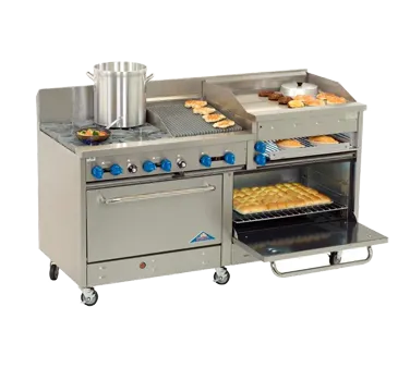 Elevate your culinary offerings with precision cooking gear. Introducing the Comstock-Castle 2F330-36B Range, a must-have for any commercial restaurant. This gas range is designed to meet the demands of a busy kitchen, with a generous 72" width and six 24000 BTU star burners. The 12" square cast iron grates provide even heat distribution, ensuring consistent cooking results. But that's not all this range also features a 36" raised griddle/cheesemelter with a 3/4" thick plate and two manual controls, perfect for melting cheese or grilling sandwiches to perfection. The stainless steel mesh flame spreader and 30" x 18" rack below the griddle add convenience and versatility. With two extra-wide ovens, each with a rack and three rack positions, you'll have plenty of space to cook multiple dishes simultaneously. The stainless steel exterior, high back riser, and shelf not only enhance the range's durability but also add a touch of elegance to your kitchen. With a 264000 BTU rating, this range delivers exceptional performance, making it a reliable and efficient choice for any commercial restaurant.