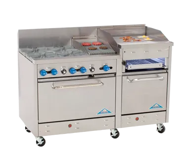 Enhance your culinary space with top-notch tools. Introducing the Comstock-Castle F3226-1.5RB-30B Range, a must-have for any commercial restaurant. This 60" wide gas range is designed to meet the demands of a busy kitchen, offering exceptional performance and durability. Equipped with two 24,000 BTU star burners and 12" square cast iron grates, it ensures even heat distribution and efficient cooking. The 30" raised griddle-cheesemelter with a 3/4" thick plate and two manual controls allows for versatile cooking options. The stainless steel mesh flame spreader and 24" x 18" rack below the griddle add convenience and functionality. With an 18" char-broiler featuring iron radiants, this range provides the perfect sear for meats and vegetables. The two standard ovens, each measuring 26-1/2" W x 21-1/2" D, offer ample space for baking and roasting. The stainless steel exterior and 7" high backguard ensure durability and easy cleaning. With 198,000 BTUs of power and NSF certification, this range is a reliable and efficient addition to any commercial kitchen.