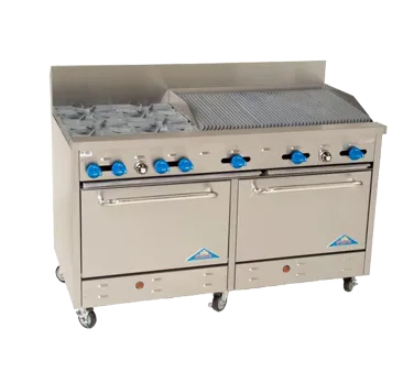 Stay competitive with innovative culinary gear. Introducing the Comstock-Castle F3226-4RB Range, a game-changer for commercial restaurants. This 60" wide gas range is designed to elevate your cooking experience and deliver exceptional results. Equipped with two 24,000 BTU star burners and 12" square cast iron grates, it ensures even heat distribution and precise control over your dishes. The 48" char-broiler with iron radiants adds a delicious smoky flavor to your grilled creations. With two standard ovens featuring enamel door and bottom linings, you can effortlessly bake multiple dishes simultaneously. Each oven includes a rack with three positions, allowing for versatile cooking options. The stainless steel exterior and 7" high backguard not only provide durability but also enhance the range's aesthetic appeal. Standing at 37" tall to the cook surface, this range offers convenience and ease of use. With a powerful 208,000 BTU output, this NSF and cETLus certified range is a must-have for any commercial restaurant looking to excel in the culinary world.