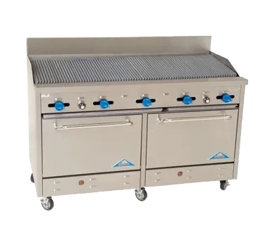 Enhance your culinary space with precision equipment. Introducing the Comstock-Castle F3226-5RB Range, a must-have for any commercial restaurant. This 60" wide gas range is designed to meet the demands of a busy kitchen, offering exceptional performance and durability. The range features a 60" char-broiler with iron radiants, perfect for achieving that delicious char-grilled flavor. It also includes two standard ovens with enamel door and bottom linings, providing ample space for baking and roasting. Each oven comes with a rack and three positions, allowing for versatile cooking options. The stainless steel exterior and 7" high backguard not only add a sleek look to your kitchen but also ensure easy cleaning and maintenance. With 6" stainless steel legs and a height of 37" to the cook surface, this range offers optimal ergonomics for your staff. With a powerful 185,000 BTU, this NSF and cETLus certified range delivers exceptional cooking performance. Upgrade your restaurant kitchen with the Comstock-Castle F3226-5RB Range and experience the difference in quality and efficiency.