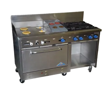 Upgrade your kitchen with cutting-edge cooking gear. The Comstock-Castle F33032-24-1RB Range is the perfect addition to any commercial restaurant. With its 60" width, this gas range offers ample cooking space for all your culinary creations. Equipped with four 24000 BTU star burners and 12" square cast iron grates, this range ensures even heat distribution and superior cooking performance. The 24" griddle with manual controls allows for precise temperature adjustments, while the 12" char-broiler with iron radiants adds a delicious smoky flavor to your dishes. The extra-wide 31" oven features enamel door and bottom linings, along with a rack with three positions for versatile baking options. The 22" wide cabinet base storage area provides convenient storage for your cooking essentials. Made with a stainless steel exterior and a 7" high backguard, this range is not only durable but also easy to clean. With a 191000 BTU rating, this NSF and cETLus certified range is a reliable and efficient choice for any commercial kitchen.