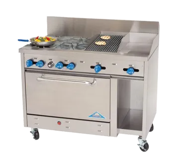 Invest in quality for flawless culinary outcomes with the Comstock-Castle F3430-12-2RB Range. Designed specifically for commercial restaurant use, this gas range is a powerhouse in the kitchen. With a width of 48 inches, it offers ample cooking space to handle high-volume demands. The range features two 24,000 BTU star burners with 12-inch square cast iron grates, ensuring even heat distribution for perfect cooking results. It also includes a 12-inch griddle with manual controls and a 24-inch char-broiler with iron radiants, adding versatility to your menu options. The extra-wide 31-inch oven comes with enamel door and bottom linings, along with a rack with three positions for efficient baking. The stainless steel exterior and 7-inch high backguard not only provide durability but also enhance the aesthetic appeal of your kitchen. With a total BTU of 148,000, this NSF and cETLus certified range is a reliable and efficient addition to any commercial kitchen.