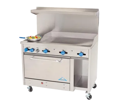 Elevate your culinary offerings with precision cooking gear. Introducing the Comstock-Castle F3430-36 Range, a must-have for any commercial restaurant. This gas range is designed to meet the demands of a busy kitchen, with a 48" wide cooking surface that includes two 24000 BTU star burners and a 36" griddle. The griddle features manual controls and a 3/4" thick surface, perfect for achieving the ideal sear on steaks and burgers. The extra-wide 31" oven provides ample space for baking and roasting, with three rack positions for versatility. With a stainless steel exterior, back riser, and high shelf, this range is not only durable but also easy to clean. The 6" stainless steel legs ensure stability and a comfortable working height of 37". With a powerful 138000 BTU output, this NSF and cETLus certified range is a reliable and efficient addition to any commercial kitchen.