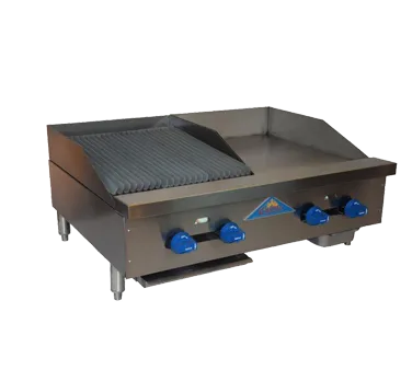 Upgrade your kitchen capabilities with top-tier equipment. Introducing the Comstock-Castle FHP36-18-1.5LB Griddle / Charbroiler, Gas, Countertop. This versatile unit is designed to meet the demands of a commercial restaurant setting. With a 36" wide x 28" deep frame, it offers ample cooking space for high-volume operations. The unit features a 18" x 21" broiler area with cast iron grates, allowing for even heat distribution and perfect grill marks on your meats and vegetables. The sloped or flat lava rock with cast iron bottom grates ensure optimal heat retention and easy cleaning. Additionally, the 18" x 21" x 3/4" thick griddle plate provides a smooth cooking surface for pancakes, eggs, and more. The stainless steel splash guards on three sides keep your kitchen clean and safe. With 76,000 BTU of power and four manual controls, this NSF and ETL certified unit delivers exceptional performance and durability. Upgrade your kitchen today with the Comstock-Castle FHP36-18-1.5LB Griddle / Charbroiler, Gas, Countertop.