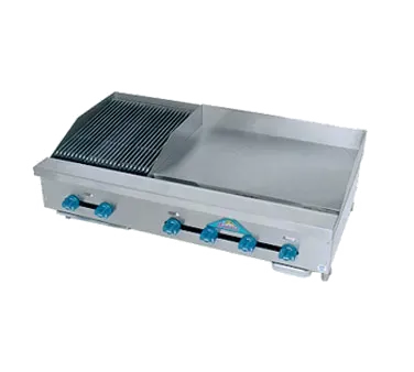 Premium cooking tools for exceptional results. Introducing the Comstock-Castle FHP48-30T-1.5LB Griddle / Charbroiler, Gas, Countertop. This versatile unit is a must-have for any commercial restaurant. With its 48" wide x 28" deep frame, it offers ample cooking space to handle high-volume orders. The unit features a 30" x 21" x 3/4" thick griddle plate, perfect for cooking pancakes, eggs, and other breakfast favorites. The char-broiler area measures 18" x 21" and comes with cast iron grates and lava rock for that authentic grilled flavor. The stainless steel splash guards on three sides ensure a clean and safe cooking environment. Equipped with two thermostatic griddle controls and two manual char-broiler controls, you have precise control over the cooking process. With a powerful 112000 BTU output, this unit delivers exceptional performance. Trust Comstock-Castle for top-quality equipment that enhances your restaurant's efficiency and culinary offerings.