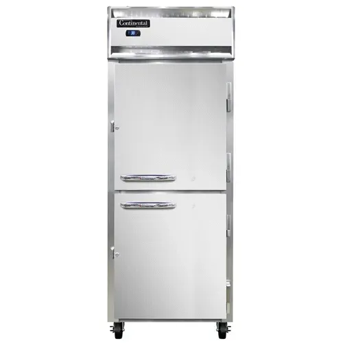 Introducing the Continental Refrigerator, 1RENSSHD, Refrigerator, Reach-In - the perfect solution to simplify restaurant operations. This extra-wide, one-section reach-in refrigerator is designed to meet the demands of a busy commercial kitchen. With its stainless steel exterior and interior, it not only looks sleek but also ensures durability and easy cleaning. The half-height solid doors provide convenient access to the contents while maintaining temperature consistency. The electronic control with a digital display allows for precise temperature management, while the hi-low alarm alerts staff if the temperature deviates from the set range. The electric condensate evaporator eliminates the need for manual defrosting, saving time and effort. Made in the USA and certified by cETLus and NSF, this refrigerator guarantees quality and compliance with industry standards. Upgrade your restaurant with the Continental Refrigerator, 1RENSSHD, and experience enhanced efficiency and reliability in your kitchen.
