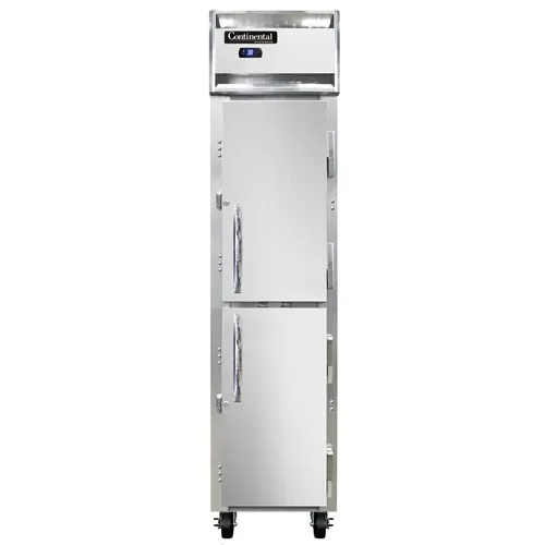 Introducing the Continental Refrigerator, 1RSESNSSHD, Refrigerator, Reach-In - the perfect appliance to dominate the culinary world. This slim line refrigerator is designed for commercial restaurant use, offering a compact yet spacious solution for your refrigeration needs. With its shallow depth and stainless steel interior and exterior, this reach-in refrigerator is not only durable but also easy to clean, ensuring optimal food safety and hygiene. The half-height solid doors provide convenient access to your ingredients, while the electronic control with a digital display allows for precise temperature management. The hi-low alarm feature ensures that you are immediately alerted to any temperature fluctuations, preventing spoilage and preserving the quality of your perishable items. Made in the USA and certified by cETLus and NSF, this Continental Refrigerator is a reliable and authentic choice for any professional kitchen. Don't settle for anything less than the best - choose the Continental Refrigerator, 1RSESNSSHD, and elevate your culinary creations.